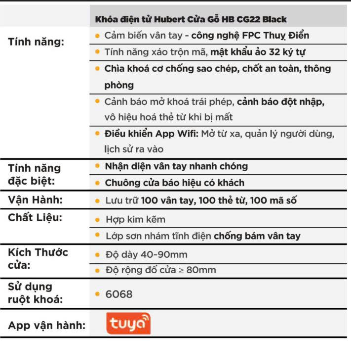Khóa Điện Tử Hubert Cửa Gỗ HB CG22 Black không chỉ mang lại sự an toàn tối ưu mà còn là một giải pháp thông minh và tiện lợi cho ngôi nhà của bạn. Với thiết kế sang trọng, chất liệu bền bỉ và các tính năng hiện đại, sản phẩm này chắc chắn sẽ làm hài lòng những khách hàng khó tính nhất.