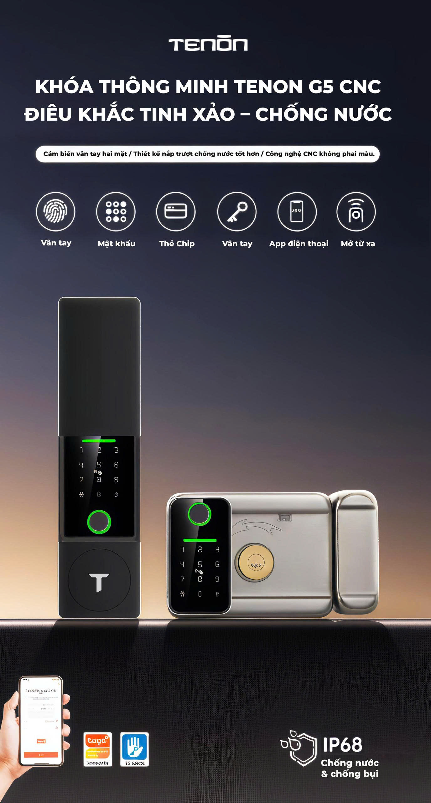 Khóa thông minh Tenon G5 được thiết kế với công nghệ cắt CNC chính xác, mang đến độ hoàn thiện tinh xảo và bền bỉ. Sản phẩm đạt chuẩn chống nước và chống bụi IP68, đảm bảo hoạt động ổn định trong mọi điều kiện thời tiết, kể cả mưa lớn hay môi trường ẩm ướt. Với thiết kế sang trọng, hiện đại và khả năng chịu lực vượt trội, Tenon G5 là lựa chọn lý tưởng cho cửa nhôm kính, vừa an toàn vừa nâng tầm thẩm mỹ không gian sống và làm việc.