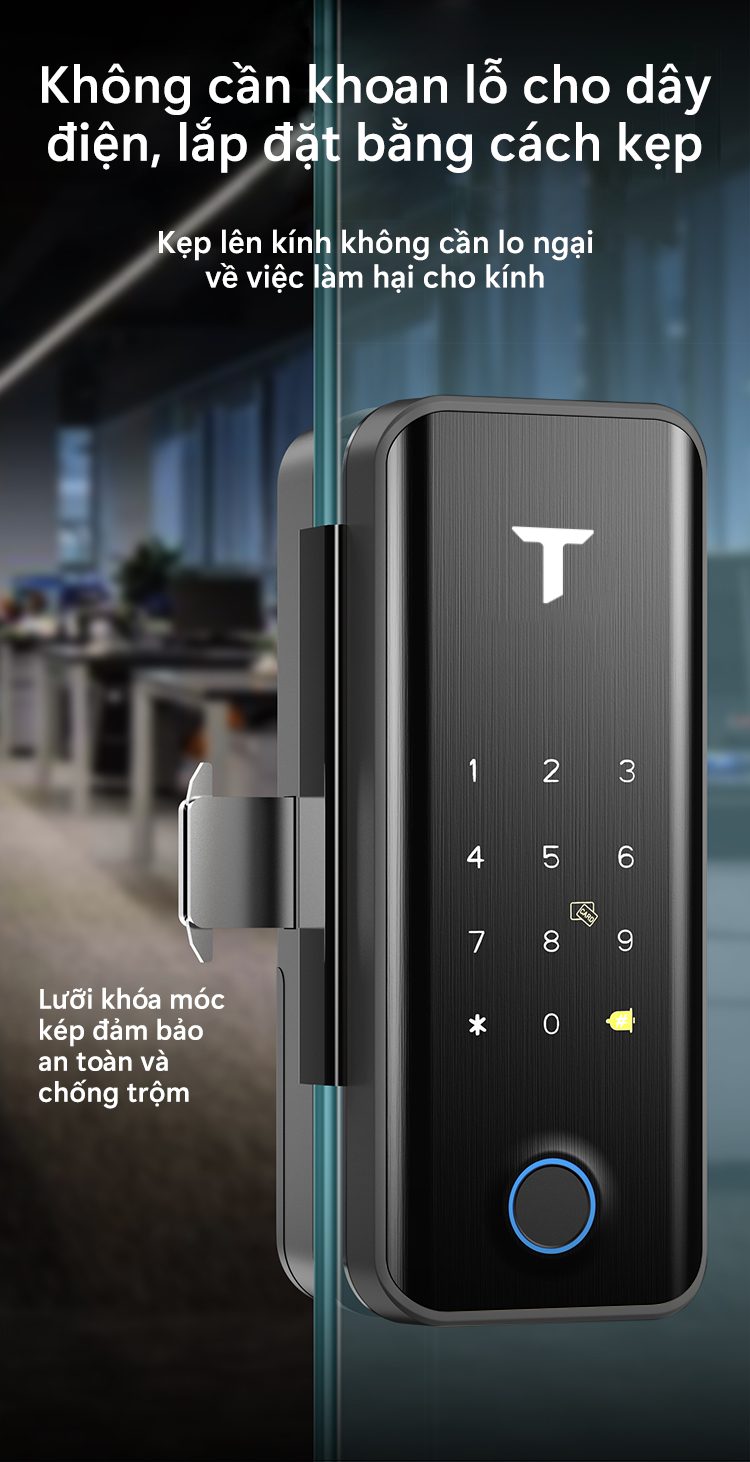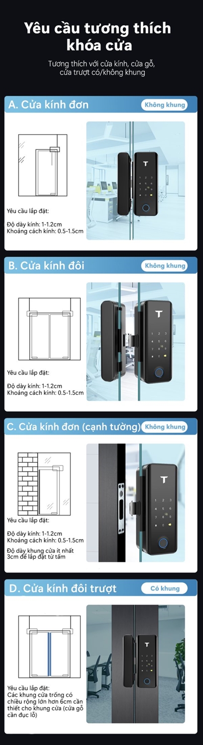 Khoá thông minh G4 thích hợp cho việc lắp đặt các loai cửa như cửa kính, cửa trượt kể cả là cửa gỗ.