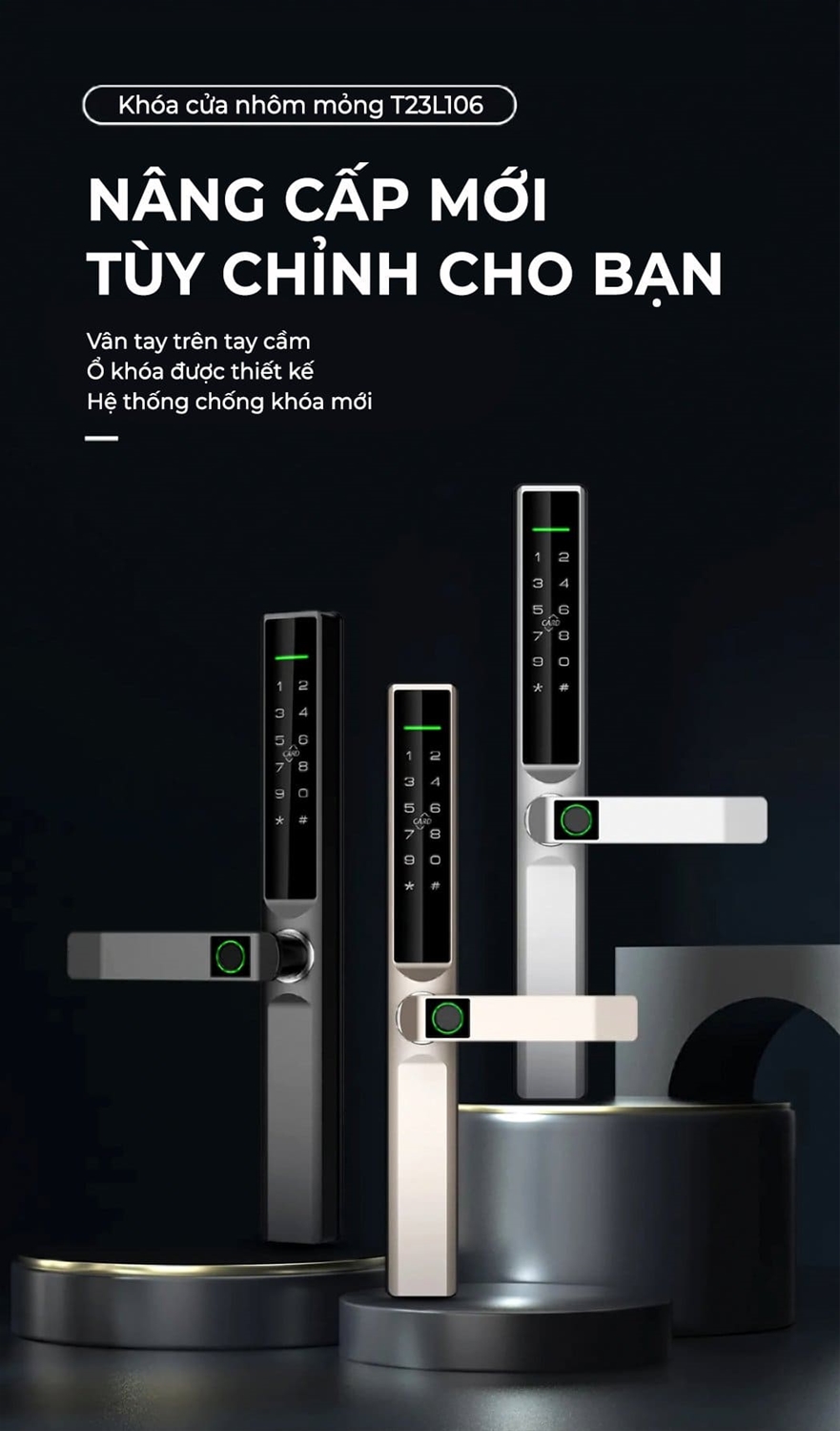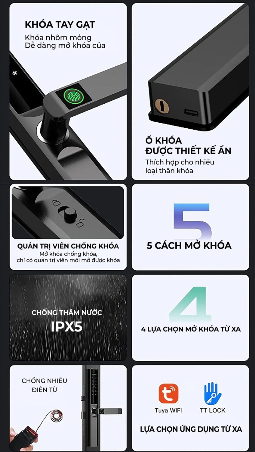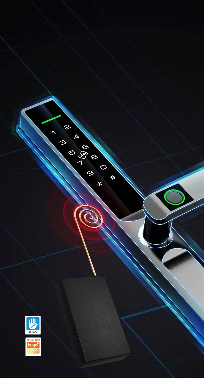 Khoá thông minh AL6 trang bị đến 05 phương thức mở khoá: Vân tay, Mật khẩu, Thẻ chip, Chìa cơ, App TUYA hoặc TTLOCK. Khoá được làm từ hợp kim nhôm mang lại sự chắc chắn khi cầm. Khoá đạt tiêu chuẩn chống nước IPX5 chững minh cho khả năng chống nước hiệu quả của khoá.